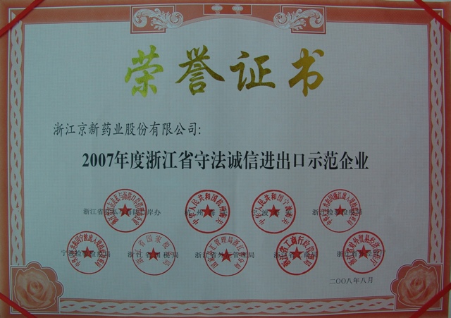 为树立遵法诚信收支口企业典范,,,,,推进收支口企业诚信系统建设,,,,,浙江省打私与海防口岸办、杭州海关、宁波海关、浙江磨练检疫局、宁波磨练检疫局、省国税局、省外汇管理局、省工商局、省外经贸厅团结在全省规模内开展了2007年度遵法诚信收支口树模企业推荐运动。。。。。。。经各市打私办与有关职能部分派合推荐,,,,,省级有关部分派合审核,,,,,宣布了2007年度浙江省遵法诚信收支口树模企业,,,,,我公司榜上著名。。。。。。。