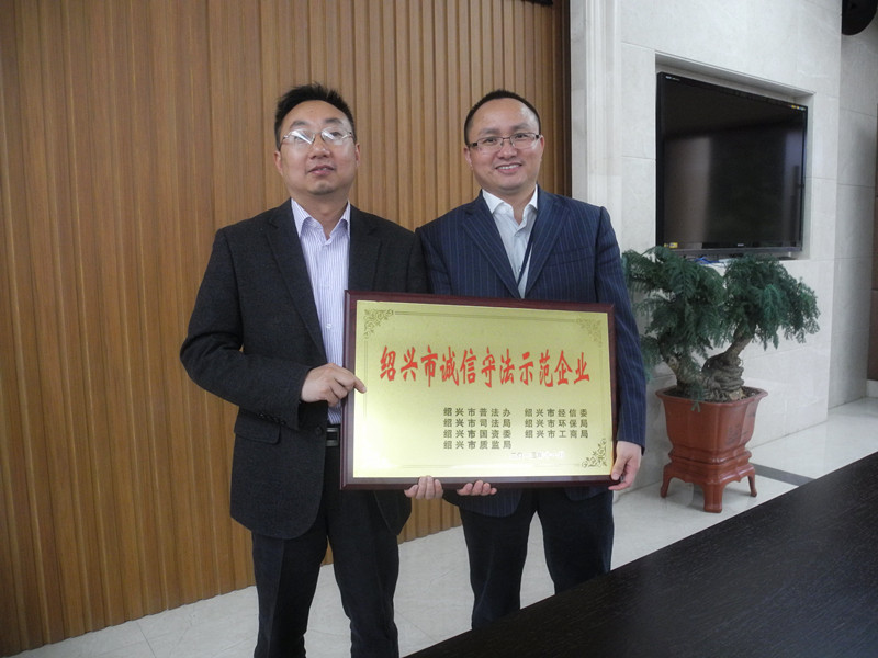 公司一直坚持忠实守信,,,,,,,依法谋划原则,,,,,,,经绍兴市普法办、绍兴市经信委、绍兴市司法局、绍兴市环保局、绍兴市国资委、绍兴市工商局、绍兴市质监局等7家部分团结评审,,,,,,,2013年11月被评定为绍兴市“诚信遵法树模企业”。。。。。