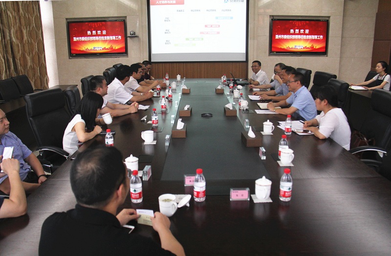 7月10日,,,,,,温州市委组织部向导一行莅临公司调研指导事情,,,,,,绍兴市委组织部、新昌县委组织部有关向导陪同,,,,,,公司副总司理周林、人力资源总监周晓峰等公司向导热情接待了温州市委组织部向导一行。。。。。。。